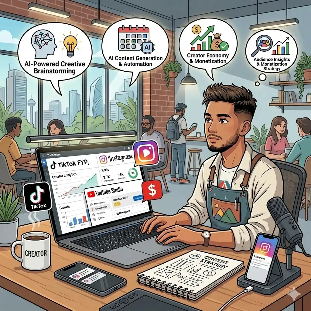 Mulai dari riset ide, penulisan skrip, desain visual, hingga analisis performa, semua dapat dibantu oleh AI. Dengan strategi yang tepat, sosial media dapat menjadi sumber penghasilan yang menjanjikan.
