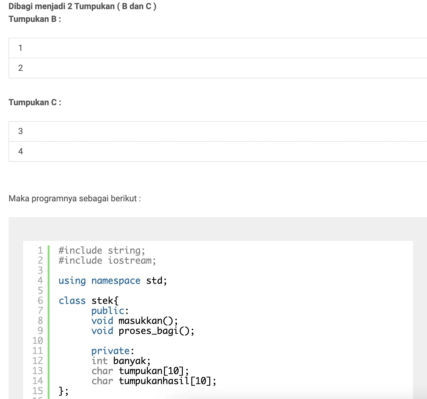 Read MoreTumpukan A : 1234 Dibagi menjadi 2 Tumpukan ( B dan C ) Tumpukan B : 12 Tumpukan C : 34 Maka programnya sebagai berikut : (lebi